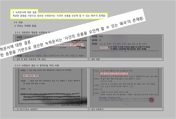 〈내용을 왜곡하여 계약조건을 상반되게 만든 녹취록에 대한 보고서 일부〉